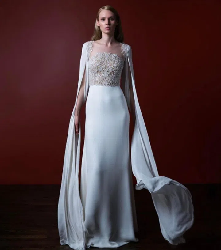 Not only does a cape give your bridal look a regal flair, the slit sleeves create a slimming and elongating effect too.