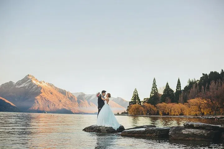 Aretha Loh and Mcken Wong against the misty mountains, trees and shimmering Lake Wakatipu in Queenstown, New Zealand.