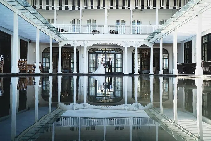 The light and angle of the architecture and pool reflection in this shot focused on Angela Chang and Terence Heng as they made their way into their celebration in The Great House in The Sanchaya Bintan, which is more like a luxurious country residence than a resort.