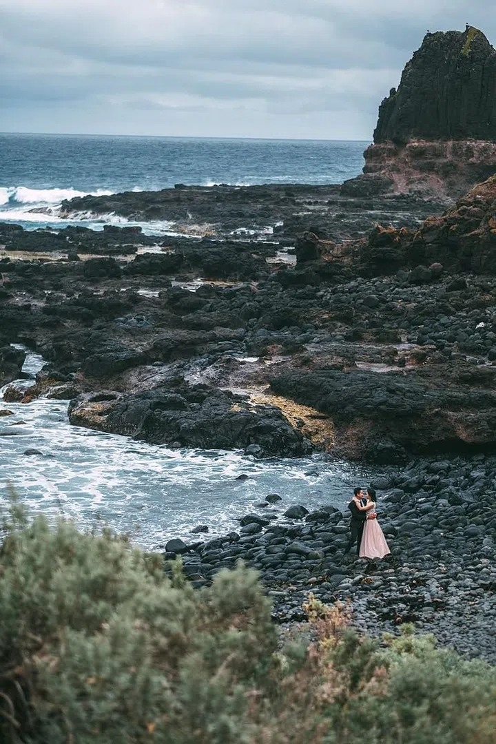 Set on being different, Rachel Ang and Jeremy Zhuang chose the gritty stones and crashing waves at Cape Schanck in Victoria, Australia, for this photo.