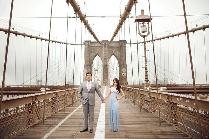The graphic lines of the Brooklyn Bridge in New York City are the focial points for Rhaema Jeremia Rachmat and Raisa Widjaja's portrait.