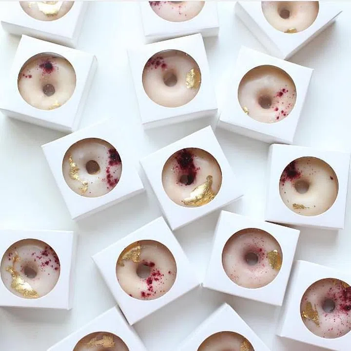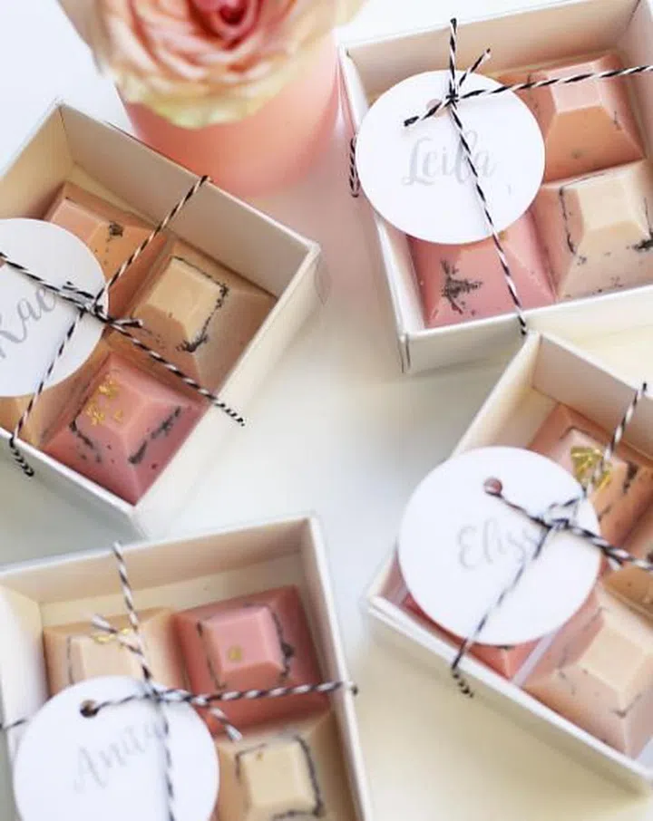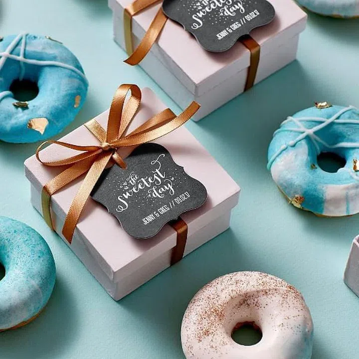 We've never seen classier donuts. Who knew this ordinary flour pastry could be all dressed up in such a manner. We love everything from the packaging to the light pink frosting and to the touch of gold. Ideal for a classy soiree or elegant wedding lunch reception!
