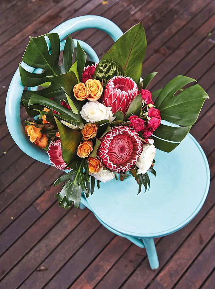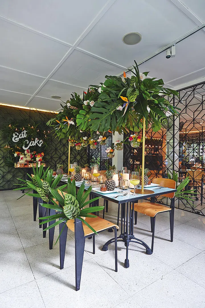 Wedding planner Rubina Tiyu of Inside The Knot designed this exuberant setting. Bursting with colour and tropical flavour, it’s perfect for the stylishly laid-back Skyve Wine Bistro.
