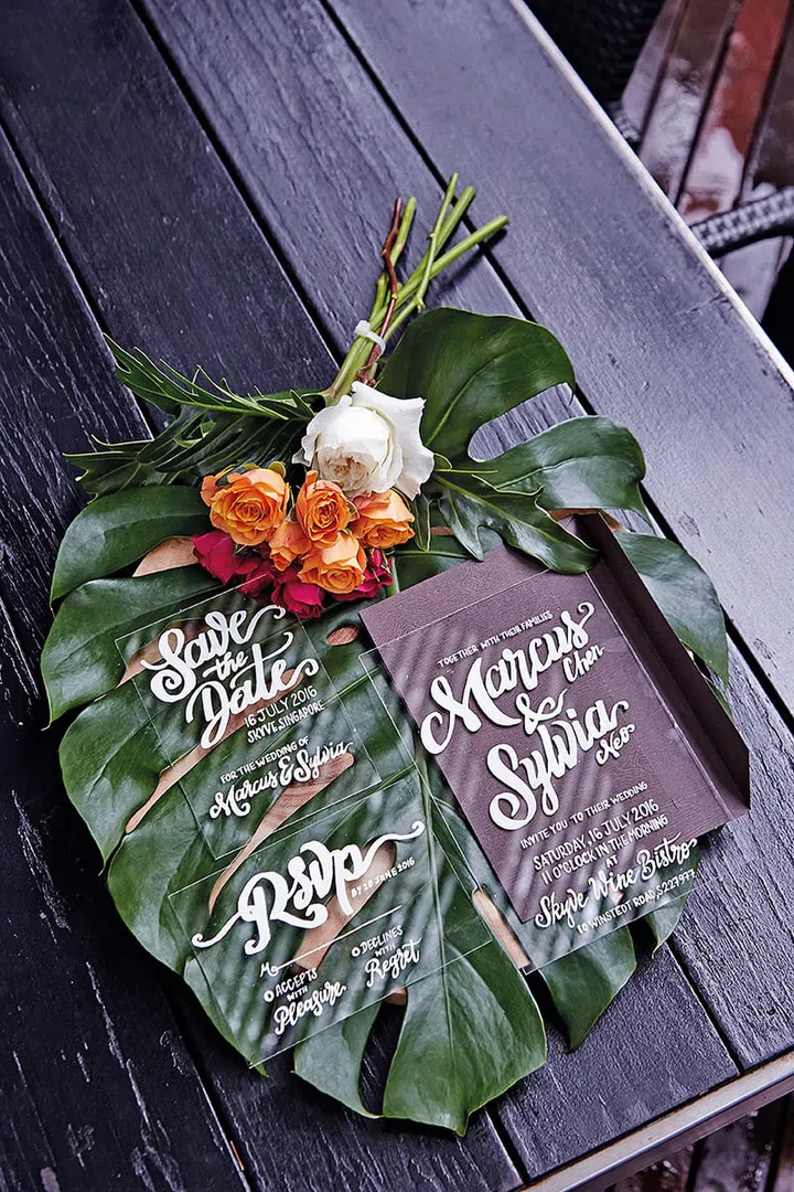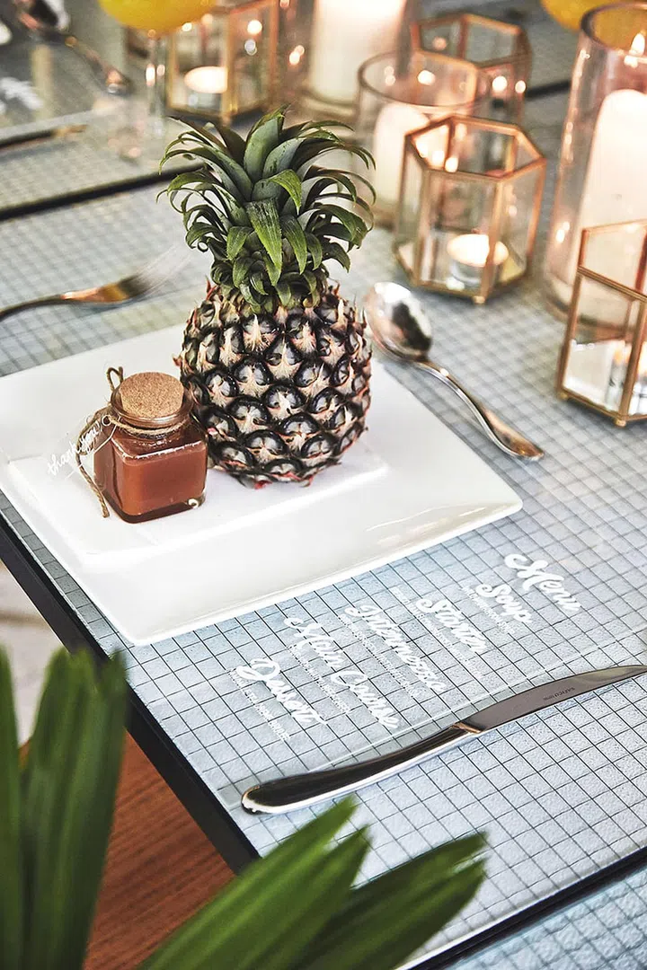 We love these unique acrylic panels with laser-engraved handwriting. For the favours: fresh whole pineapples and bottled pineapple jam.