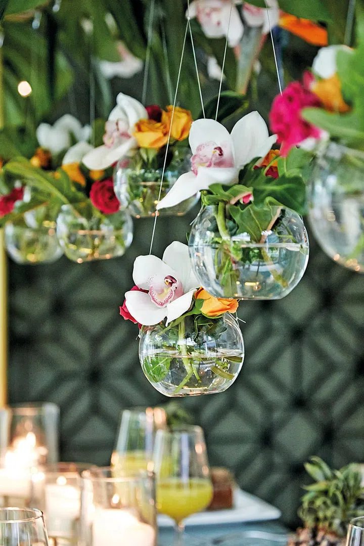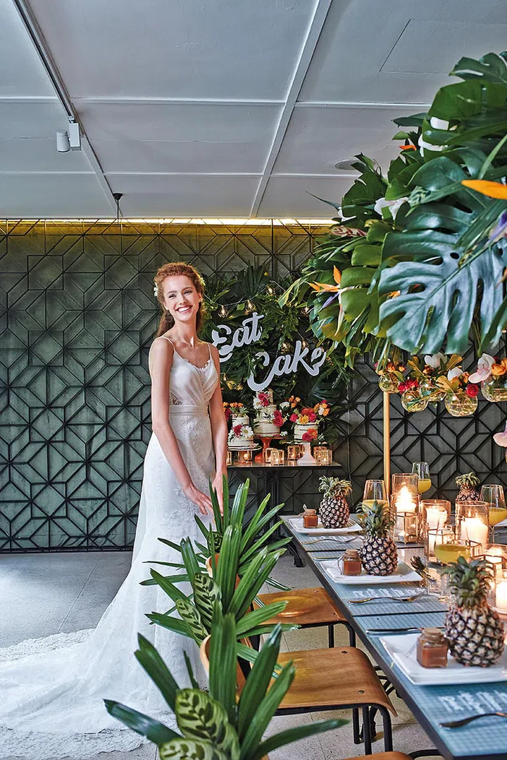Lush foliage interspersed with vibrant blooms and hints of gold set the scene for a lively reception. Rubina also added a delightful touch to the tables with real pineapples and candles of varying heights. As the bride, all you have to do is to look effortlessy stylish in a spaghetti-strapped number.