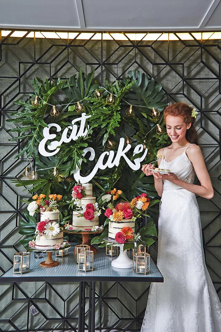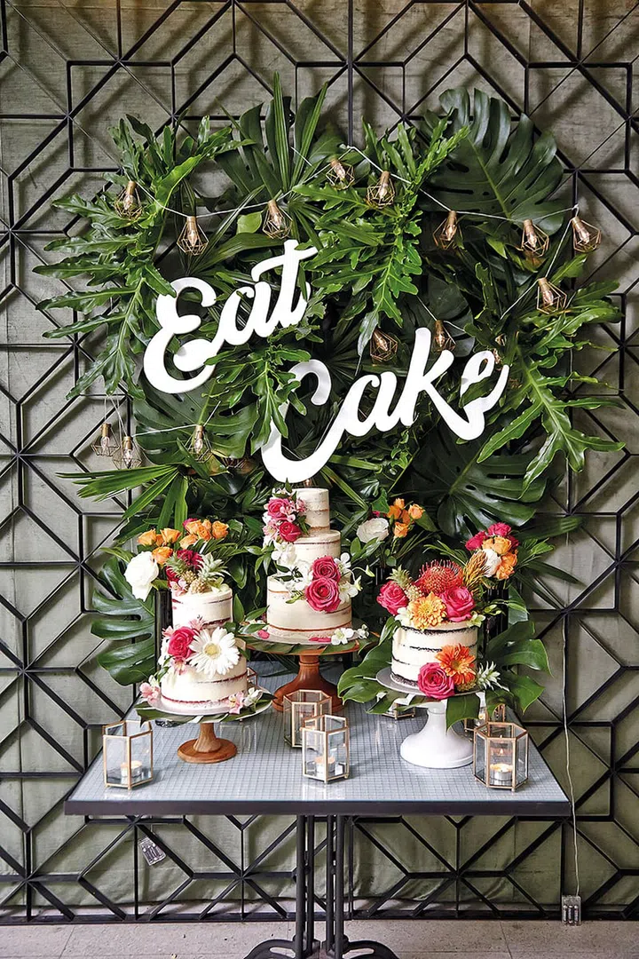 Why have one naked cake when you can have three? Decorated with brightly coloured blooms, and set against a great backdrop of greens and lights, these get the attention they deserve.
