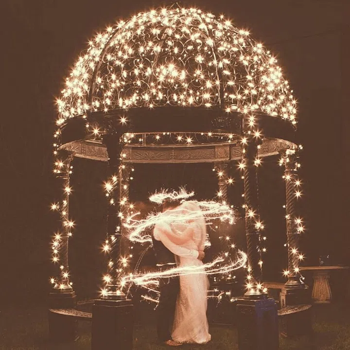 Get your bridal party for help with this - preferrably if they are dressed in white, to fade off in the background like "smoke", or in black to blend into the background when creating these magical strings of lights to surround you and your groom!