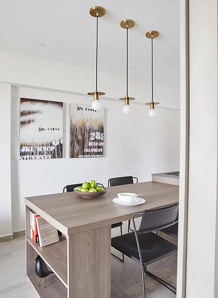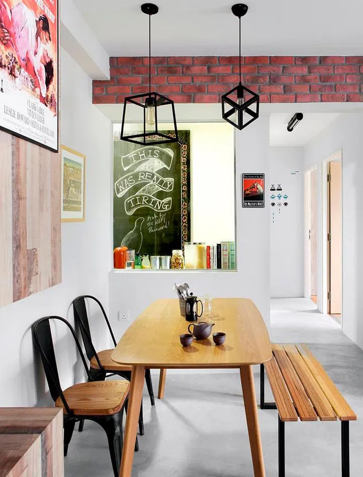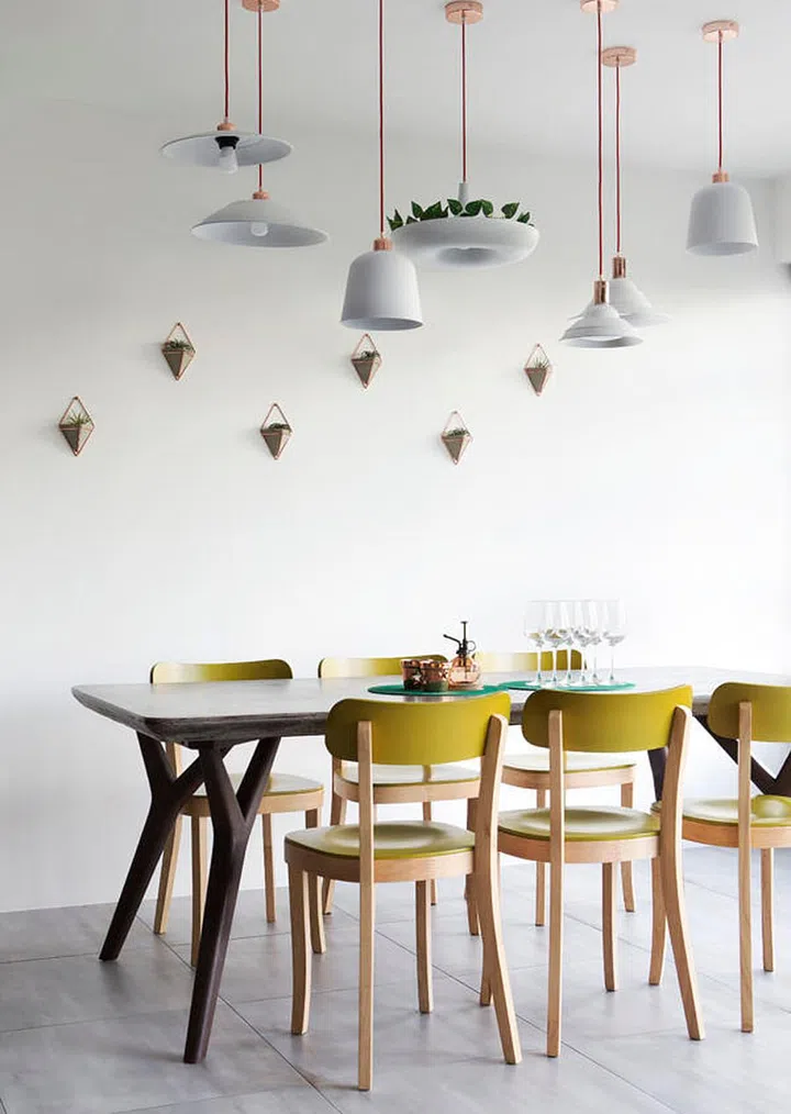 Pendant lamps at multiple lengths, scattered wall decor, and coloured dining chairs give this space a quirky edge!