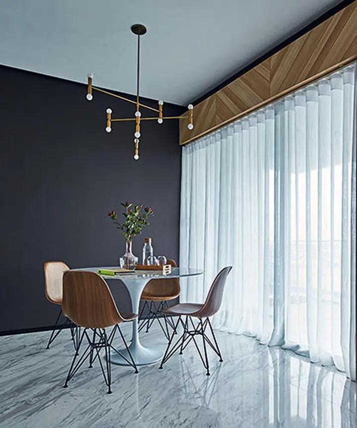 A dark wall creates a bold look and lets the silhouette of a light-coloured, well-designed dining set stand out.