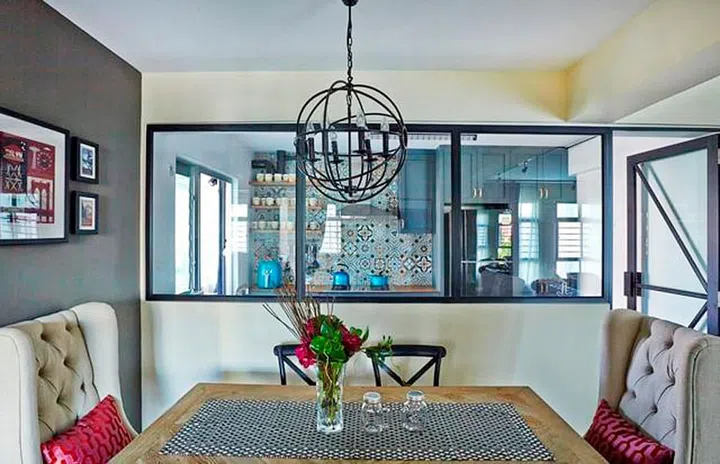 Tucked into a corner, this dining area is spruced up with geometric motifs.