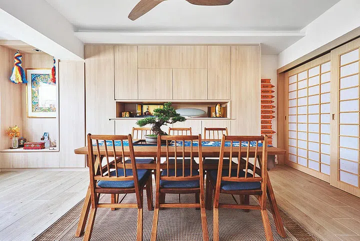 This dining area exudes a warm ambience, thanks to the plentiful wood elements.