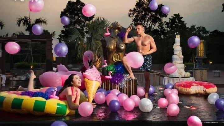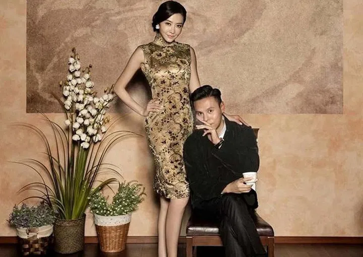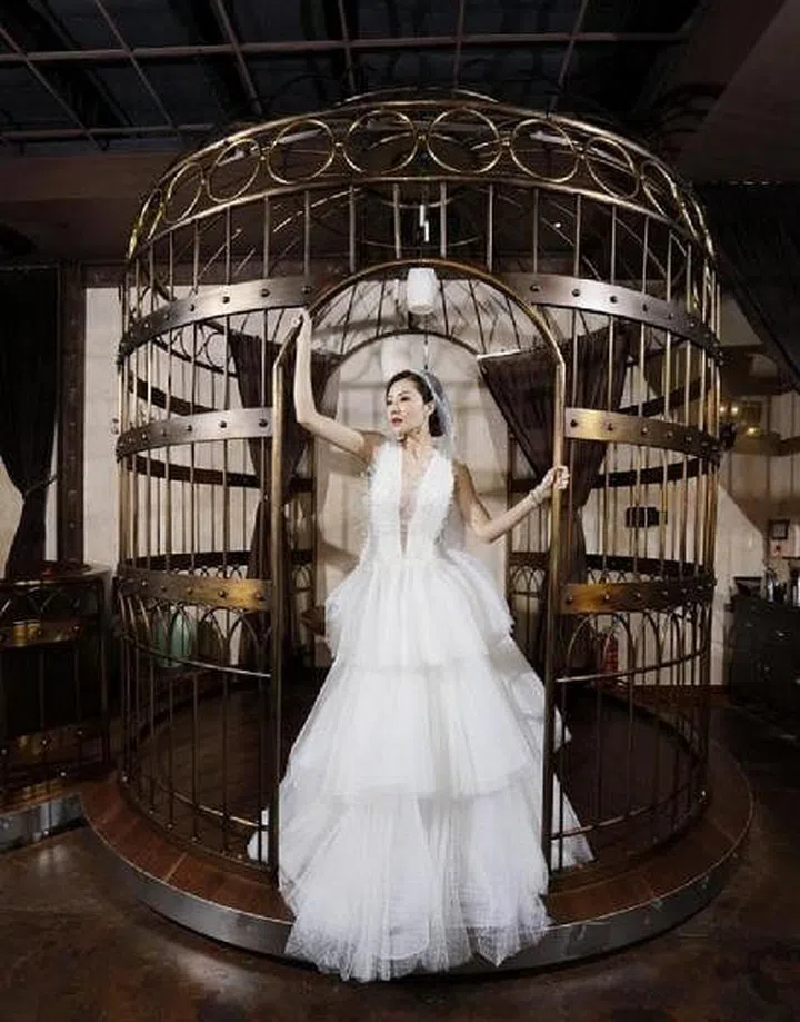 In an opulent bar, a charmed Kwok gazed at his bride who was clad in a backless black gown. The couple also flaunted their toned bodies in a pool party photo - complete with colourful floats. Another photo showed the newlyweds doing a champagne toast in the back of a car filled with balloons and pom poms. The photo that stood out from the album may be the one of Hung in a form-fitting cheongsam while her Chinese suit-clad husband drank from a tea cup - a nod to her role as Ip Man's wife in the hit martial arts film series. After the photo shoot, the blissfully married Hung said that she has found the "Ip Man" of her life in Kwok, a man who will protect her.
