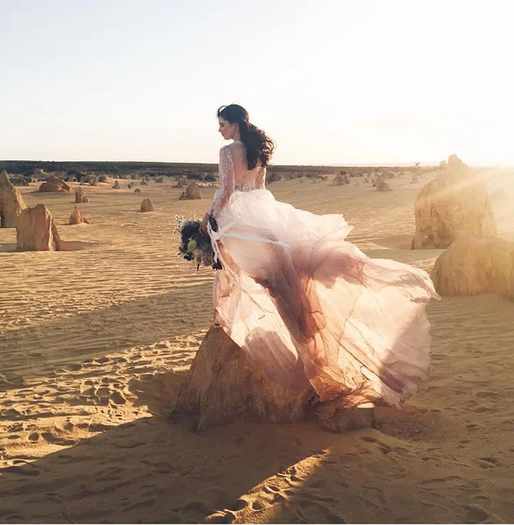 When you've got a dramatic landscape, go with the mood of your surroundings. One trick we often deploy during shoots - throwing up the skirts to create movement and more drama. The key is to make it look natural.