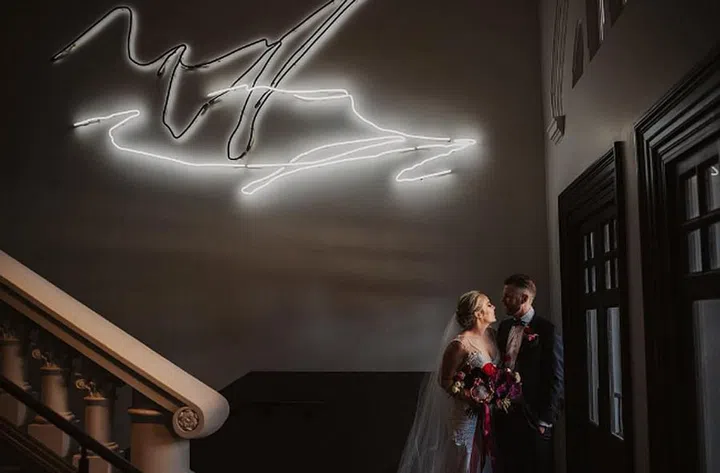 Look for interesting wall fixtures, decor or murals that can give your pictures extra pizzazz. This neon sign adds a urban, street-style appeal.