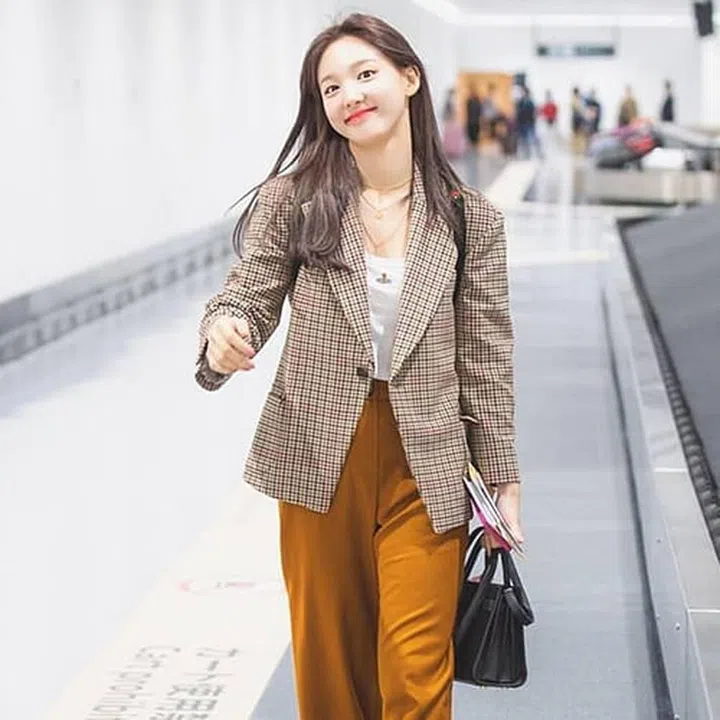 Blazers are not just great for the office. Twice’s Nayeon is proof that you can rock the sharp piece at the airport and dress it down with a white top, mustard wide-legged pants and a comfy pair of classic white sneakers.