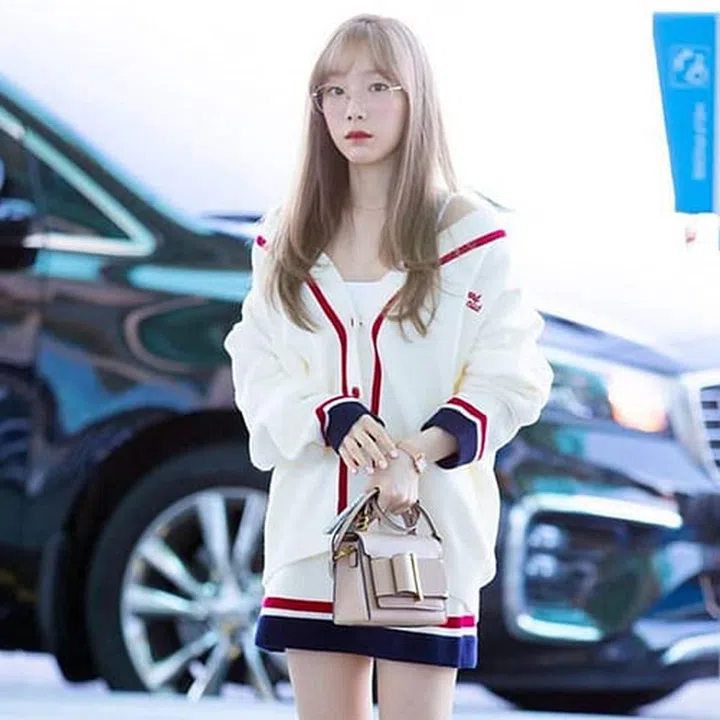 Swapping your contact lenses for a pair of glasses not only adds a dose of preppy chic, but it also prevents any discomfort and irritation from the dry, recycled aeroplane air. Taeyeon also shows us how to wear an oversized knit stylishly - that's slightly off-shoulders.