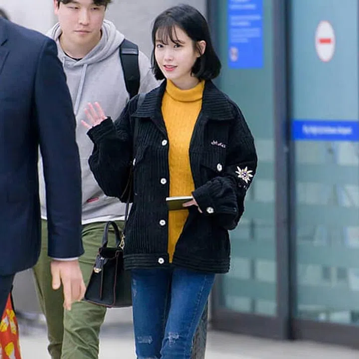 Another way to dip your toes and add a pop of colour to your ensemble is to go with a bright knit like beloved singer IU. Matching it with an oversized jacket and distressed denim ensures that you look youthful and fresh.