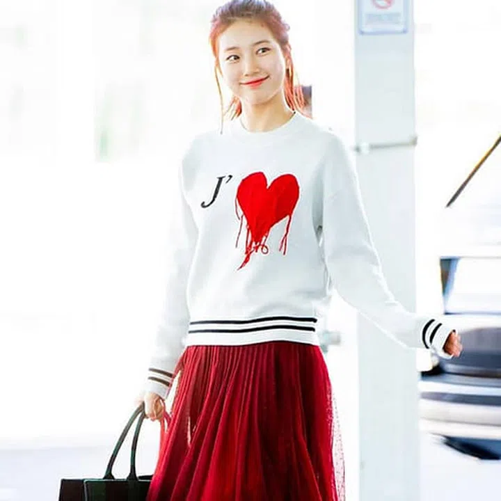 While many might opt for neutral (read: plain) colours while travelling, Suzy Bae isn’t afraid to shake things up with brighter colours. She balanced her statement-making fiery red tulle skirt with a light grey jumper and the popular Dior Book Tote.