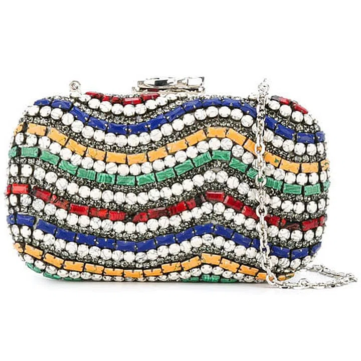 This embellished clutch is crafted from multicoloured nappa leather and comes with detachable silver curb chains to customise the bag to your own liking. To introduce groovy retro graphics to your party get-up, get a clasp of this piece.