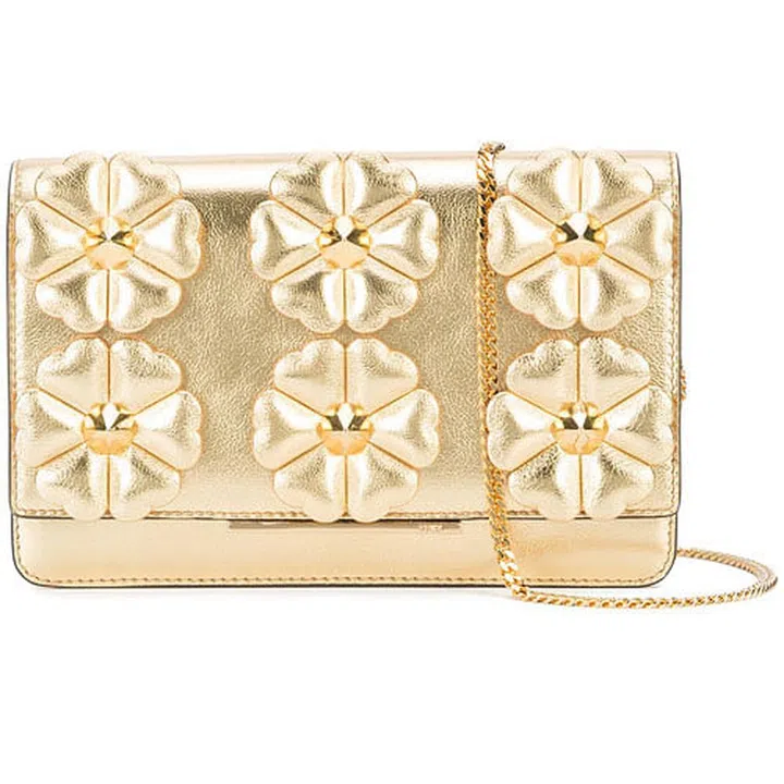 Shine bright with this gilded clutch from Fendi. The plushy floral-emblazoned crossbody-styled bag will elevate the elegant factor in your outfit as you dance the night away.