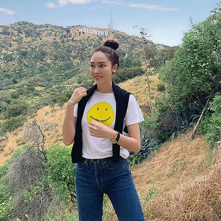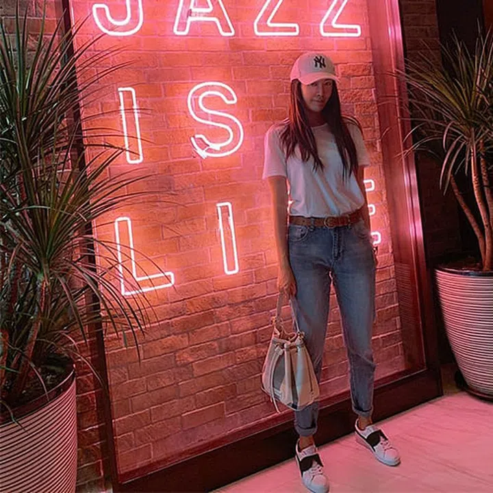 Summertime means you’re going to want to be lightening up the colours of your wardrobe and your makeup, on top of keeping your mood sunny and unconcerned. Jessica Jung aces the former with a happy graphic tee (it does after all have a cartoon smiley).