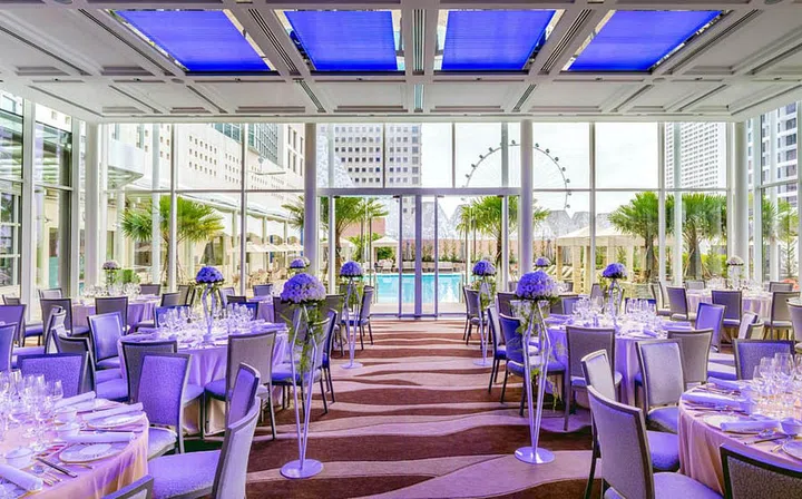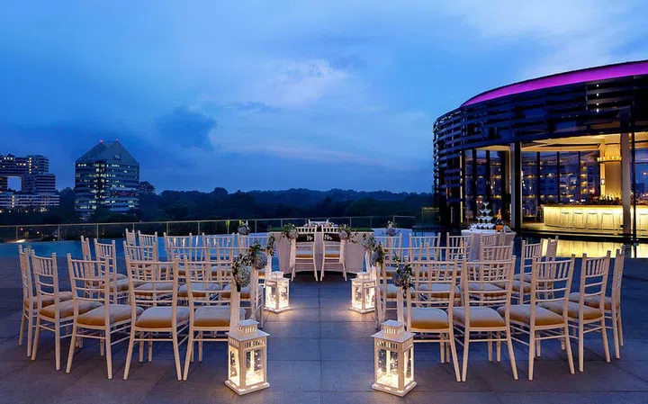 The Conrad Centennial Singapore's new Pavilion with a junior ballroom is one to head to if you're dreaming of an uber-stylish celebration. The three-sided glass structure marries the glamour of getting wed in ballroom with a beautiful rooftop view of skyscrapers and the Singapore flyer.