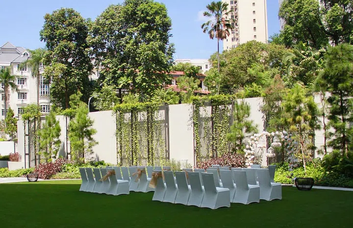 These two brand new hotel establishments are situated near Orchard Road and share a spacious manicured courtyard filled with lush greenery. Flanked by tall white walls and lined with trees, plants and trellises of flowering vines, it's lovely for exchanging your vows in an intimate setting. It comes with the convenience of air-conditioned function rooms nearby for your post-ceremony event.