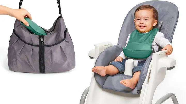 And once mealtime is over, it rolls up neatly into its silicone pocket, making it perfect for on-the-go dining. As the baby grows, the secure closure can be adjusted for a perfect fit.