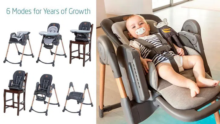 This high chair's design evolves with the child, offering six modes that cater to six years of growth. It also prioritises comfort with its five recline positions and nine adjustable height settings. Moreover, younger babies and toddlers will benefit from the seat inlay, ensuring they're snug and supported.