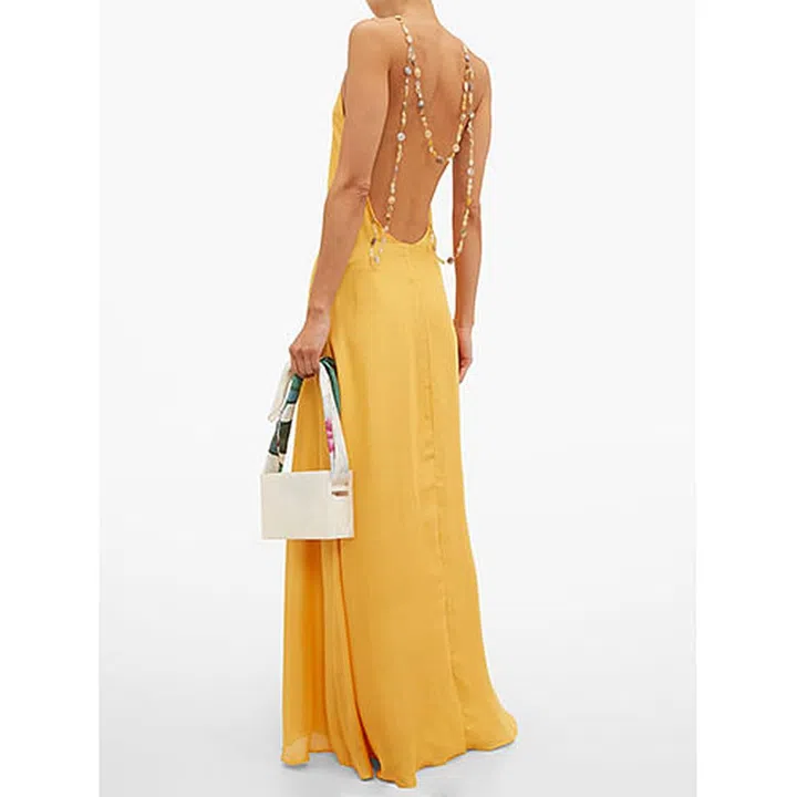 Despite this Cult Gaia number being all bright and cheery, it still looks refined and polished due to its silk upper. The cherry on top goes to the hand beaded quartz stones fashioned onto the straps on the back of this number. Complement its A-line silhouette with a pair of strappy heels.