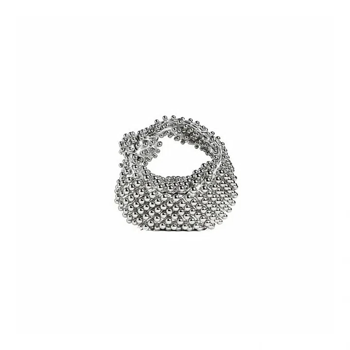 First launched in January 2020, Bottega Veneta’s Mini Jodie bag has just received a punk treatment for Pre-Fall. Metallic round studs – either in reflective silver or the brand’s signature chroma green – have been manually applied all over the bag’s signature intrecciato weave body, demonstrating the brand’s usual impeccable craftsmanship. The resulting effect is a softly-constructed pouch-shaped bag with major tactile appeal.