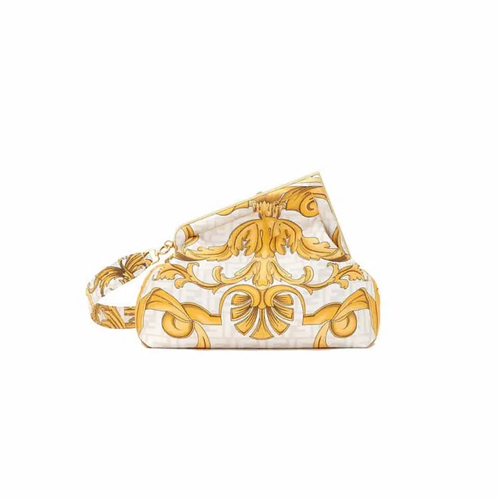 Launched in July 2021, the Fendi First clutch was Kim Jones’ debut bag for the brand as its new artistic director of womenswear and is known for its asymmetrical shape and witty F-shaped opening. Flash forward to this season and the piece has received a very ’80s glam update as part of the Fendace collaboration with Versace: the bag is swathed in a gold baroque print that the latter uses frequently for its silk shirts.