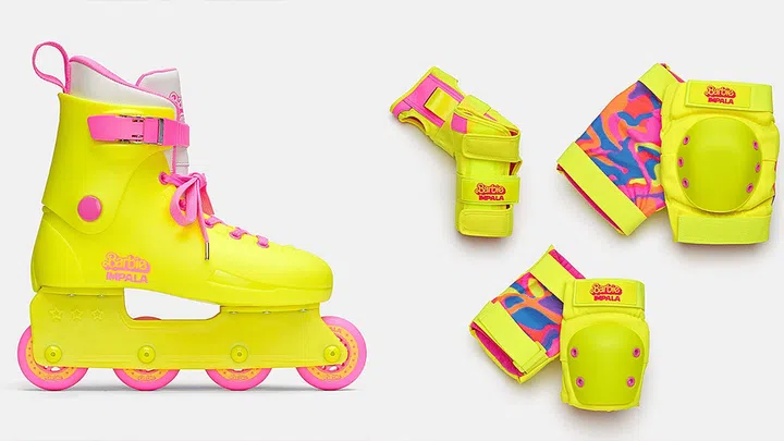 In this official collaboration, American skate brand Impala has released a capsule with the star product being the Lightspeed Inline Skate in Barbie Bright Yellow ($243). As safety comes first, the capsule includes a protective pack of knee, elbow and wrist pads for adults ($84) and kids ($76).