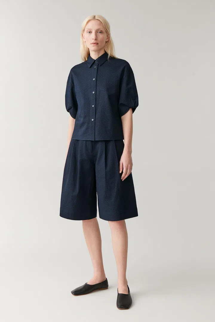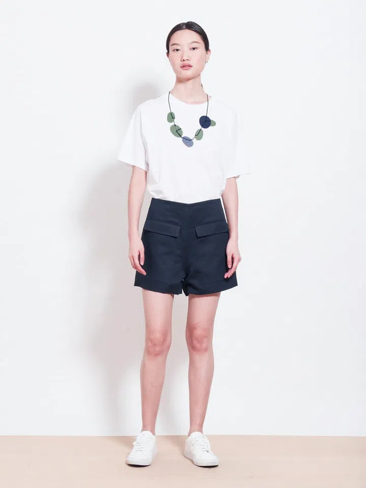 Like minimalism? Then you’ll love how sleek and simple this pair of navy cotton shorts looks. Wear it with a understated blouse and geometric necklace to complete your back-to-office look.