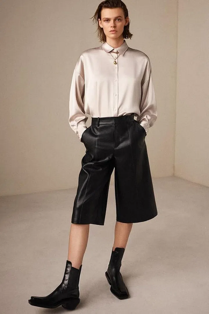 A basic black pair of faux leather bermudas will never go out of style. Plus, it’ll add an edge to almost anything that you have in your wardrobe, from a floral print blouse to a simple white tee.
