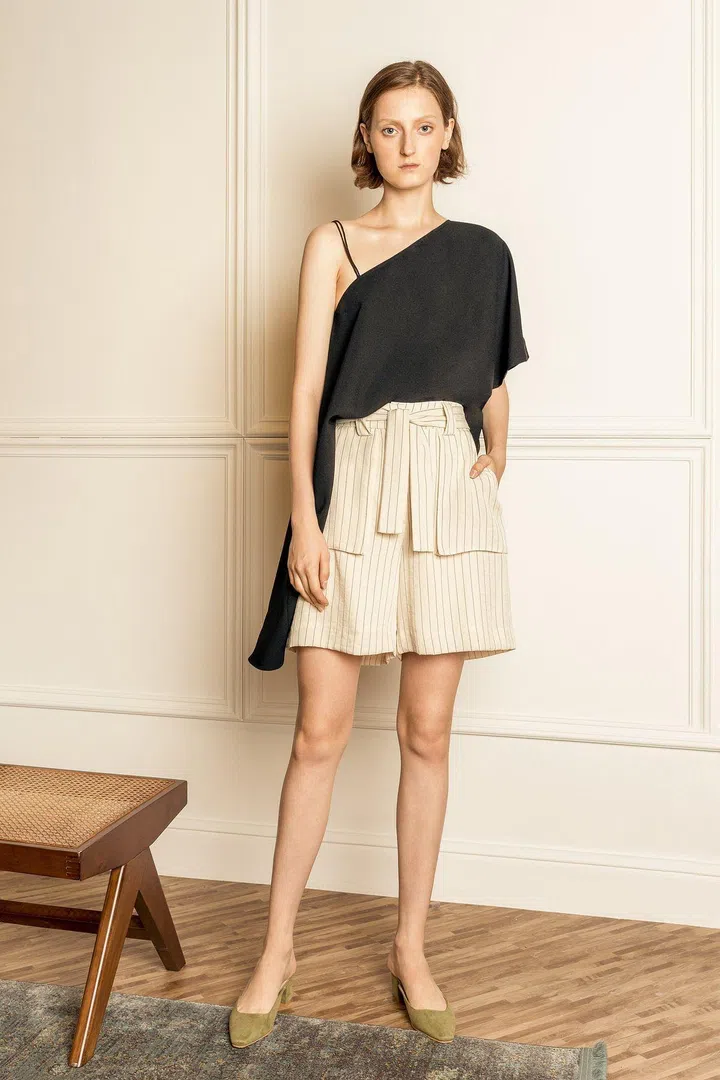 Pinstripes, a regular pattern on boardroom-ready pieces, exude a grown-up and sophisticated appeal. Match your pinstripe bermudas with an asymmetric top to leave a lasting impression at your business meetings.