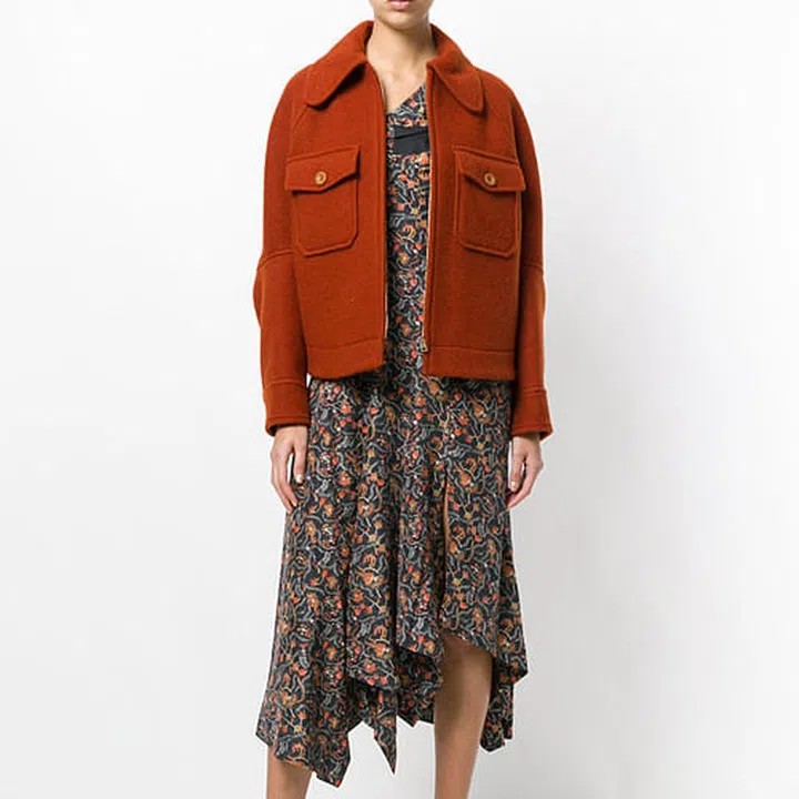 The secret to avoid looking schlubby is to go for an outerwear with built-in structure. Whether it's a boxy motorcycle jacket or a stiff felted jacket, the combination of sharp and soft makes for an immaculate polished look. This burnt orange jacket kindles blithe seventies spirit, and is a great in-flight choice for layering up against the AC.