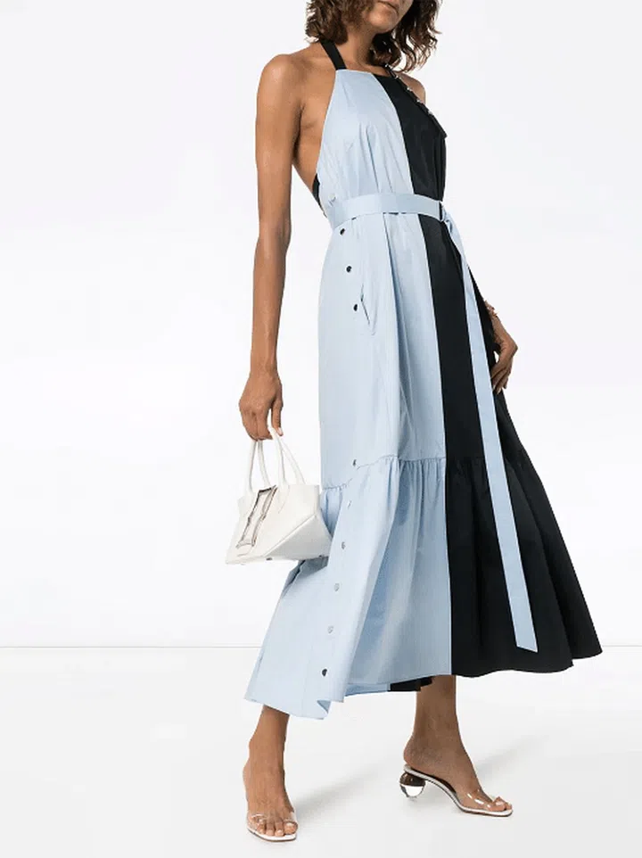 It can be tough choosing between two colours that you love, which is why Tibi solved the issue for us with this two-toned panel bi-colour halterneck dress. Don this swishy dress with button details to the boardroom, then on a romantic date night out with your boo. Opt for transparent clear peep-toe heels to dial back on the colours and avoid looking too overwhelming.