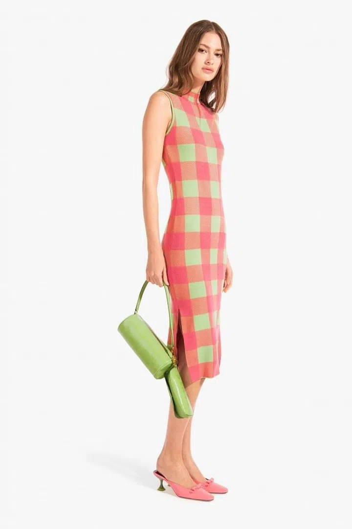 When we think gingham, our minds tend to associate the word with a less than spectacular black-and-white miniature checkered print. Staud here is debunking all of our uninspiring stereotypes of the gingham print and proving to us that even gingham can be refreshing and on trend with this vibrant neon green and pink pattern in a stretch-jacquard knit. Of course, we appreciate how this modern print was set atop a conventional mod dress silhouette. Pull off this number with our edit of neon accessories.