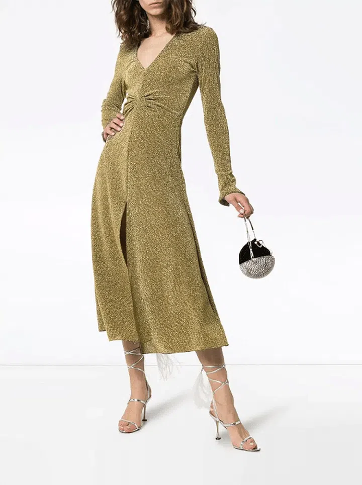 Some dresses are the embodiment of "business in the front and party in the back", but this dress is the epitome of business and party all at the same time. This glittery gold lurex midi dress is the perfect one-piece to throw on for hassle-free styling and also an ensemble that's disco dancing-worthy. Go for gold by completing the look with gold jewellery and heels.