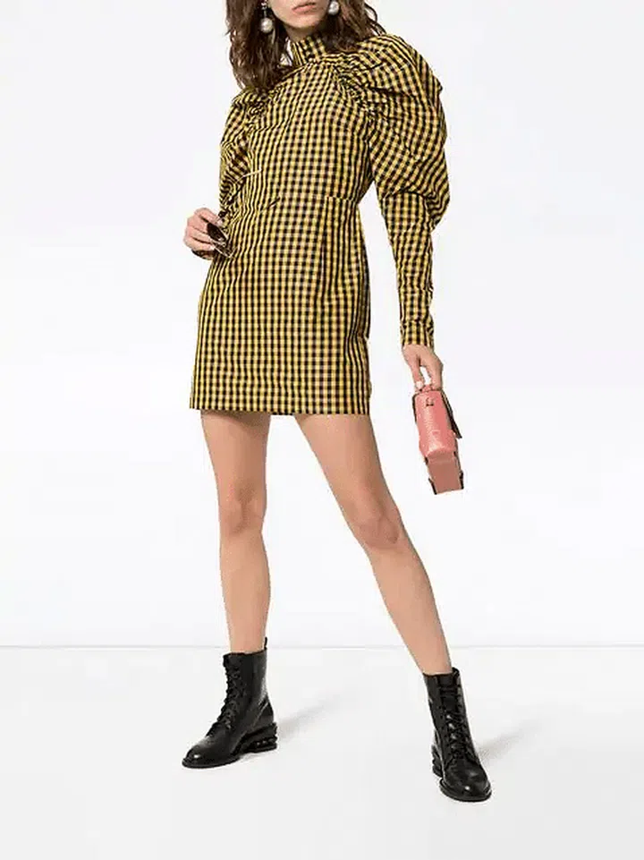 Still riding on the high of and yellow coloured trend, this high neck gingham midi dress is speaking to our souls. We love the sense of regality that the heightened collar, Rouleau-button fastening at the front and long voluminous sleeves are serving us. Finish it off with knee-length sock boots for a polished fashionable working woman look.
