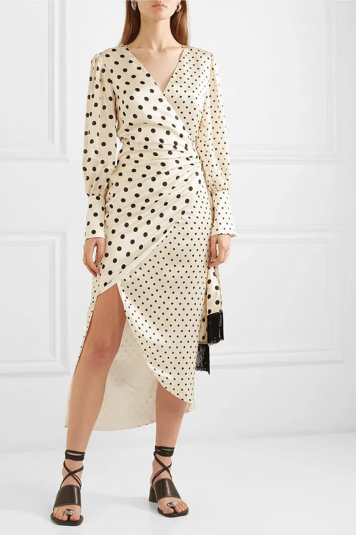 This Mother of Pearl number is the formula to instantly feeling elegant with very little effort. Polka dots are always cute, which is why this dress has a vote from us. It's cut from lustrous silk-satin that drapes beautifully and is decorated in contrasting polka dots of varying sizes. It's a twist on the universally flattering wrap dress style as it fastens with black tassel fringe ties. The slit of this dress allows for showing off some tasteful skin. Make your legs appear longer with gladiator lace-up sandals.