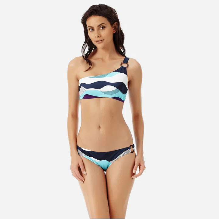 Asymmetrical bikini top Ostende, $242.99, and asymmetrical brief bikini bottom Ostende, $205.61, Vilebrequin.