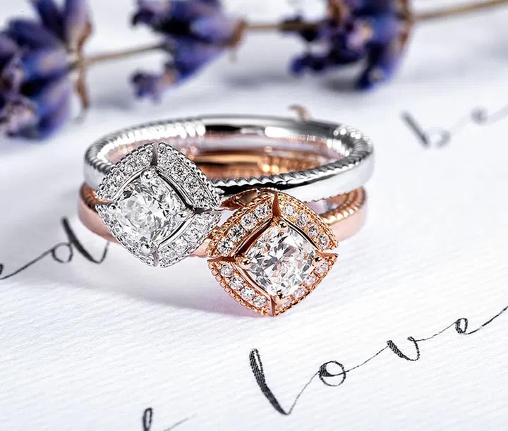 Soo Kee Jewellery's Bell of Love collection, which includes these gorgeous rings, are inspired by the joy and happiness of a marriage bound by commitment. Available in 18K white and rose gold, each design features a cushion-cut diamond surrounded by smaller diamonds.