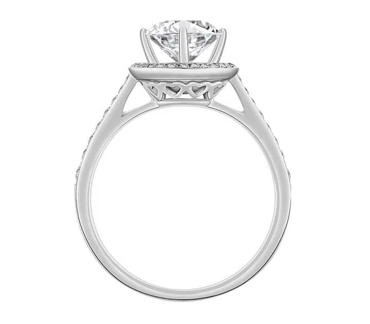 This one comes nestle atop a four-prong setting with whimsical hearts woven into the design for an eye-catching and charming sparkler.
