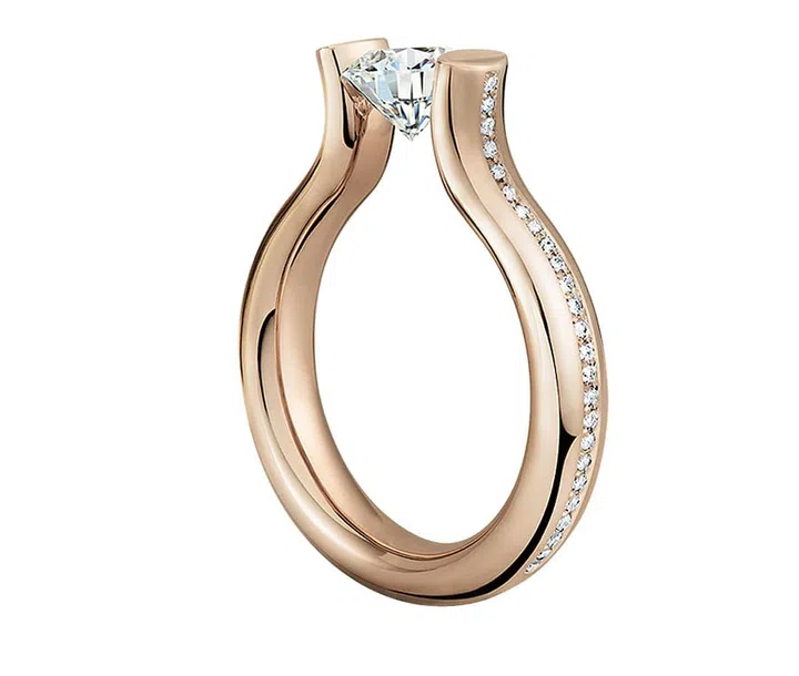 With a sleek slim band that employs tension to hold a (seemingly floating) diamond in place, the Niessing Heaven Highlights has an additional line of smaller sparkling diamonds that turn up the shine and glamour of the brand's iconic engagement ring.