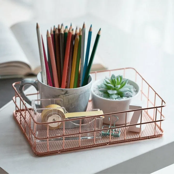 Besides using these rose gold metal baskets to organise your home office desk, they can also be used to group your skincare and makeup products on your beauty counter. You could also stash them in your wardrobe for socks and lingerie or to create an aesthetic corner with candles and plants.