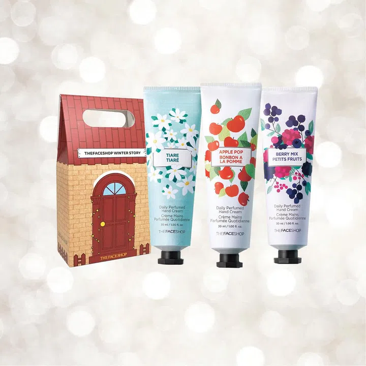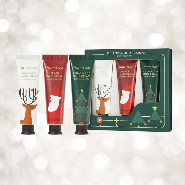 Packed in nifty tubes with Christmas designs, this three-piece box set comes with a Gardenia Hand Cream, Peach Hand Cream and Cedar Wood Hand Cream. From Innisfree stores.