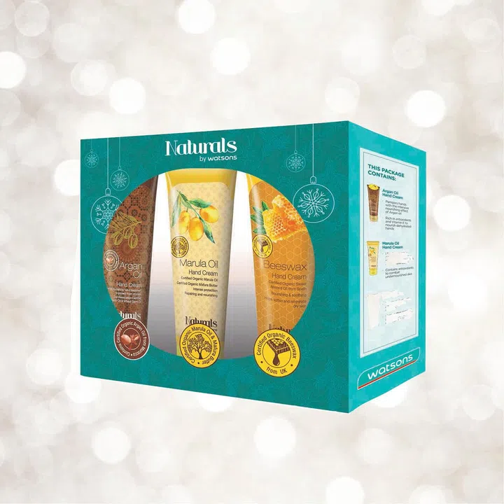 This includes an Argan Oil hand cream, Marula Oil hand cream and Beeswax hand cream to help nourish hands. From Watsons.