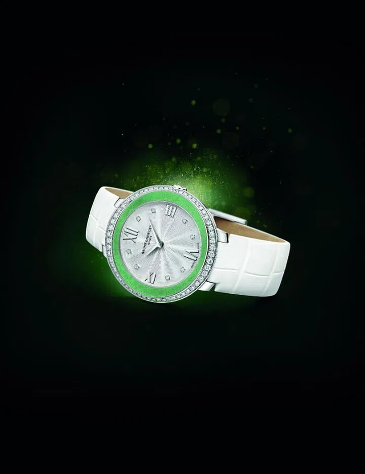 According to the 185-year-old Swiss brand, the use of jade on the limitededition Promesse watch ($17,000) is its way of paying homage to Asia. But making this timepiece didn’t come easy. “The development of this watch was a nightmare because of the jade’s fragility. The jade used is less than 1mm in thickness,” says Alexandre Peraldi, director of design at Baume & Mercier. There are only eight Promesse Jade watches available in the world.